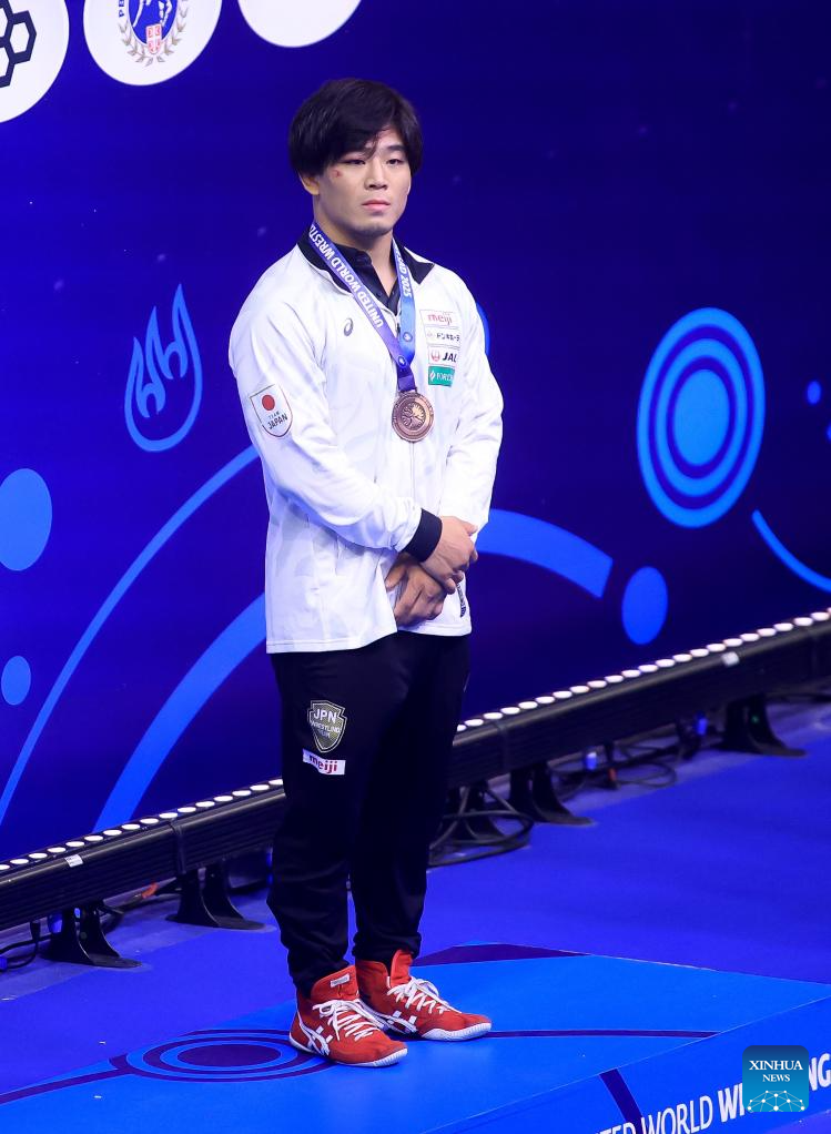 Bronze medalist Japan's Aoyagi Yoshinosuke pose for the photo during medals ceremony of the men's freestyle 74 kg category at the U23 Wrestling World Championships in Novi Sad, Serbia on Oct. 25, 2025. (Photo by Predrag Milosavljevic/Xinhua)