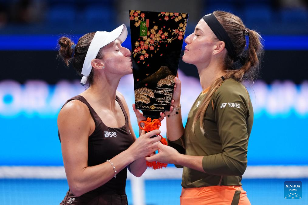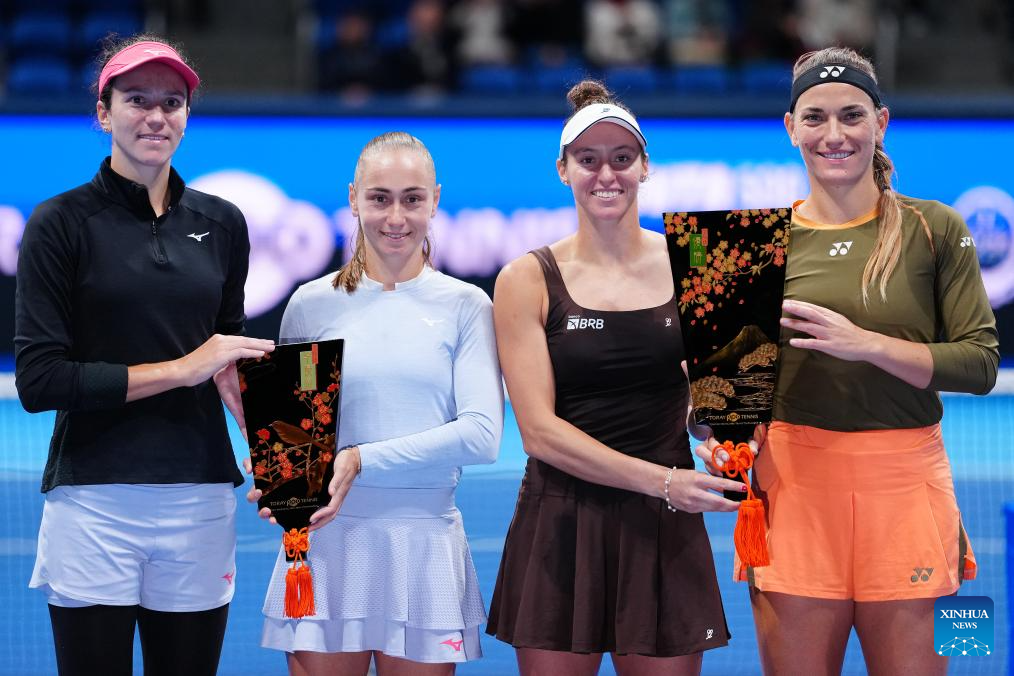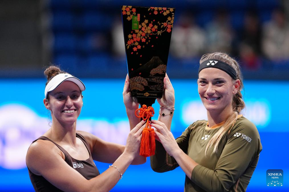 Timea Babos (R, Hungary) / Luisa Stefani (Brazil) celebrate during the awarding ceremony after the women's doubles final match between Timea Babos (Hungary) / Luisa Stefani (Brazil) and Anna Danilina (Kazakhstan) / Aleksandra Krunic (Serbia) at the Pan Pacific Open tennis tournament in Tokyo, Japan, on Oct. 26, 2025. (Xinhua/Jia Haocheng)