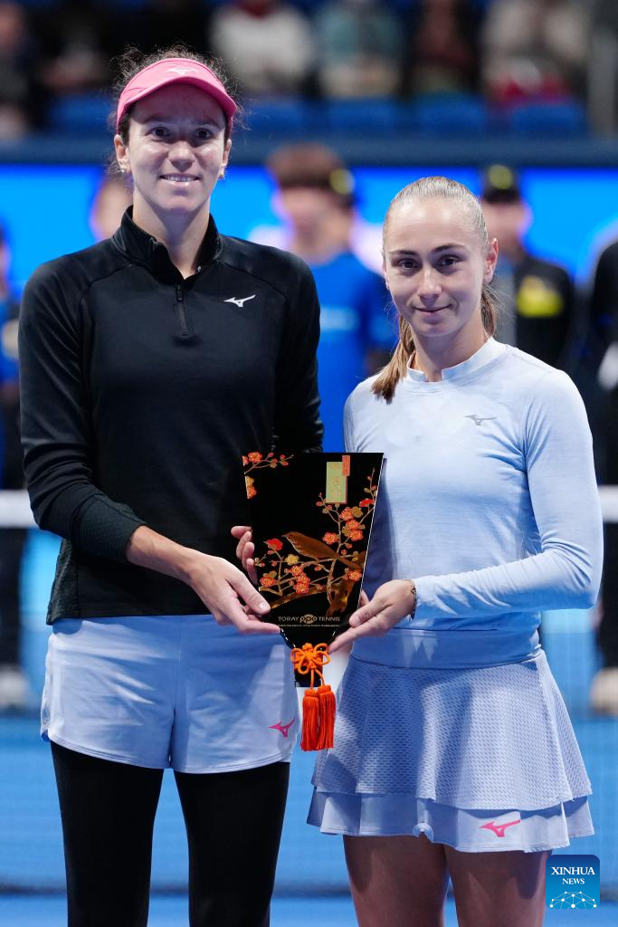Anna Danilina (L, Kazakhstan) / Aleksandra Krunic (Serbia) react during the awarding ceremony after the women's doubles final match between Timea Babos (Hungary) / Luisa Stefani (Brazil) and Anna Danilina (Kazakhstan) / Aleksandra Krunic (Serbia) at the Pan Pacific Open tennis tournament in Tokyo, Japan, on Oct. 26, 2025. (Xinhua/Jia Haocheng)
