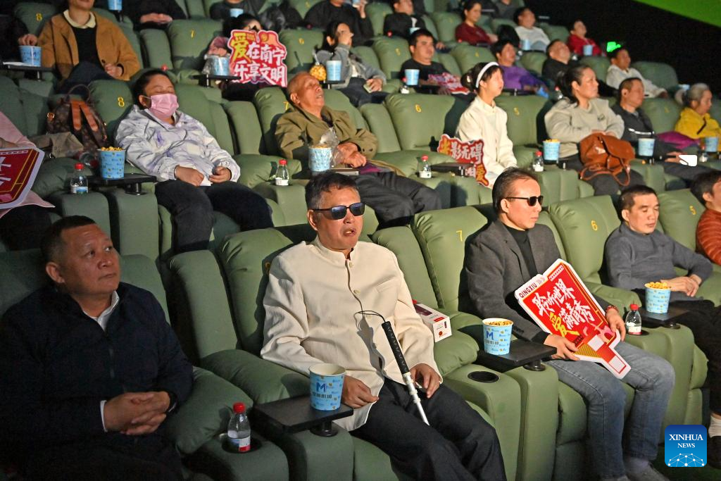 Visually-impaired people, together with their family members and volunteers, enjoy a movie at a cinema in Nanning, south China's Guangxi Zhuang Autonomous Region, Dec. 3, 2025. (Xinhua/Zhou Hua)
