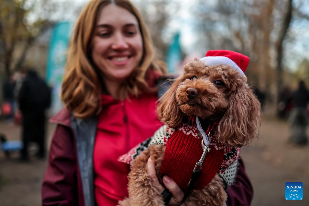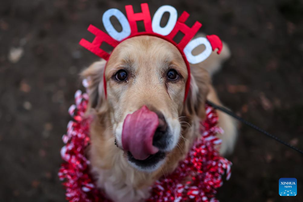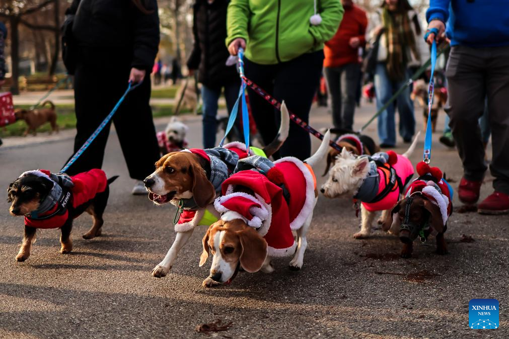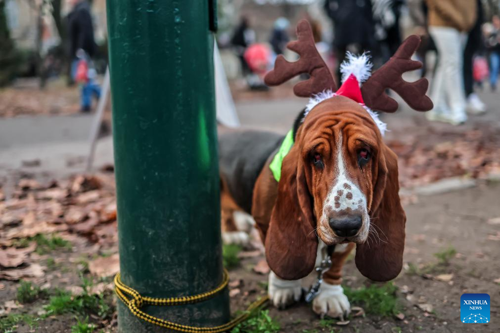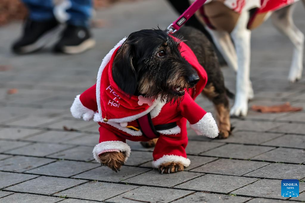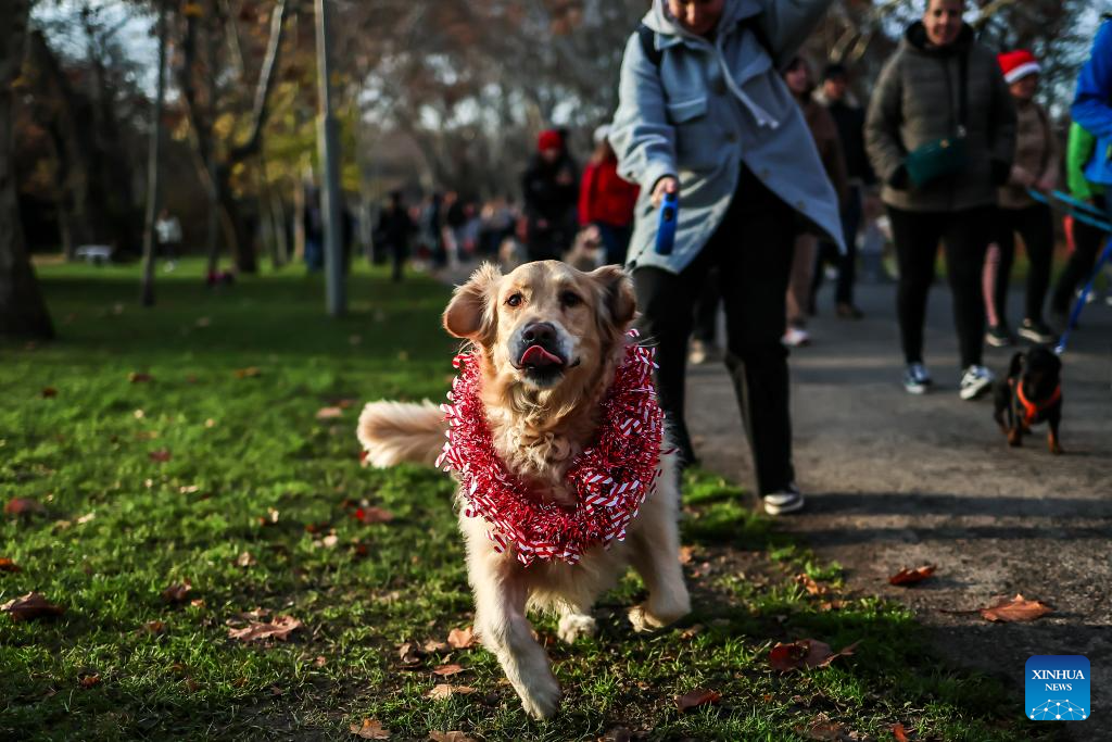 A dog participates in an annual "Santa Dog Walk" event at the City Park in Budapest, Hungary on Dec. 6, 2025. The Christmas-themed event brings together dog owners from across the city for a seasonal walk, promoting responsible pet ownership and encouraging outdoor activities for families and their pets. (Photo by David Balogh/Xinhua)