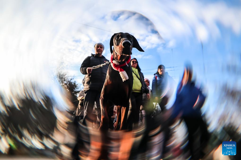 Participants walk with their dog during an annual "Santa Dog Walk" event at the City Park in Budapest, Hungary on Dec. 6, 2025. The Christmas-themed event brings together dog owners from across the city for a seasonal walk, promoting responsible pet ownership and encouraging outdoor activities for families and their pets. (Photo by David Balogh/Xinhua)