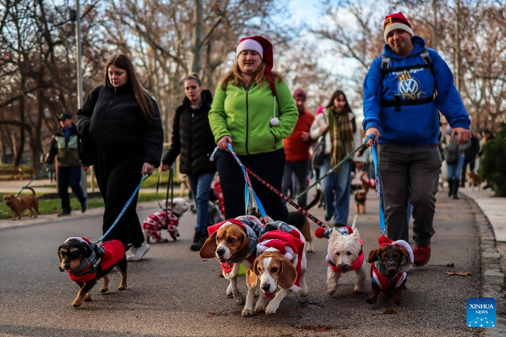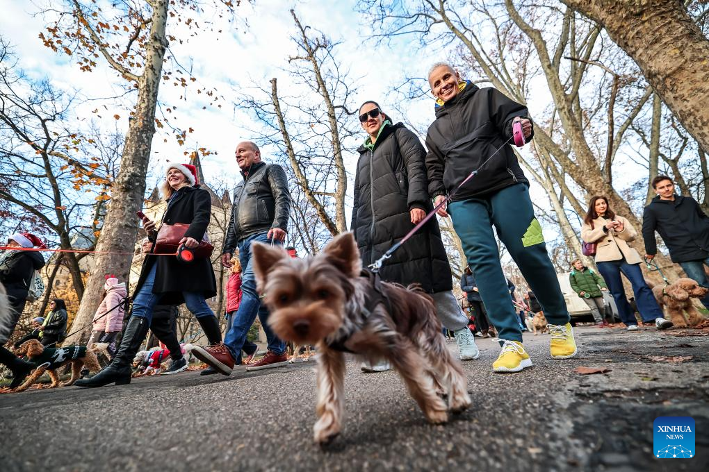 Participants walk with their dogs during an annual "Santa Dog Walk" event at the City Park in Budapest, Hungary on Dec. 6, 2025. The Christmas-themed event brings together dog owners from across the city for a seasonal walk, promoting responsible pet ownership and encouraging outdoor activities for families and their pets. (Photo by David Balogh/Xinhua)