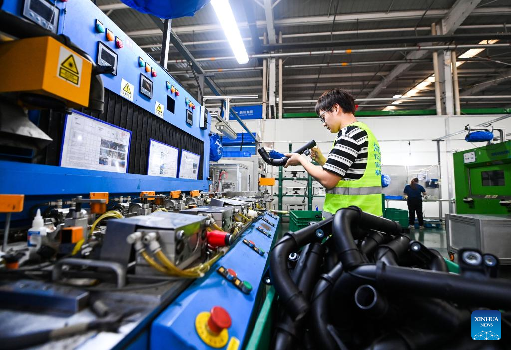 A staff member checks an automotive rubber hose at a workshop of Pengling Co., Ltd. in the town of Zhongtang, on the outskirts of Tianjin, north China, Nov. 5, 2025. (Xinhua/Zhao Zishuo)