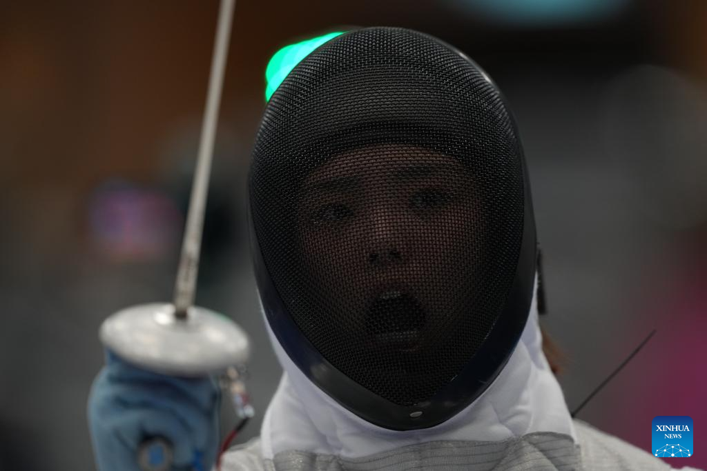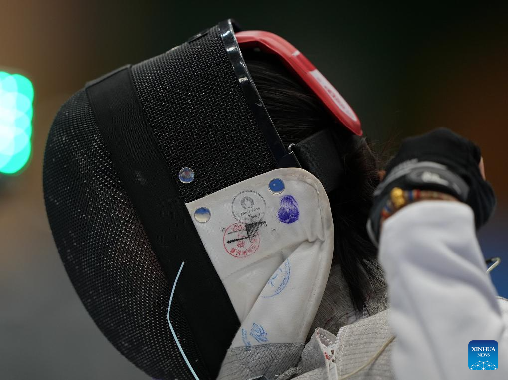Zou Xufeng of team Shanghai-Jiangsu reacts during the women's foil team gold medal match of wheelchair fencing at China's 12th National Games for Persons with Disabilities and the 9th National Special Olympic Games in Hong Kong, south China, Dec. 10, 2025. (Xinhua/Hou Zhaokang)