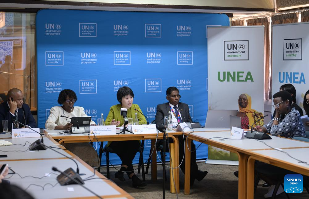 Guo Fang (3rd L), Chinese vice minister of ecology and environment, speaks at a press conference on the Chinese-backed Kunming Biopersity Fund (KBF) on the sidelines of the seventh session of the United Nations Environment Assembly in Nairobi, Kenya, Dec 10, 2025.