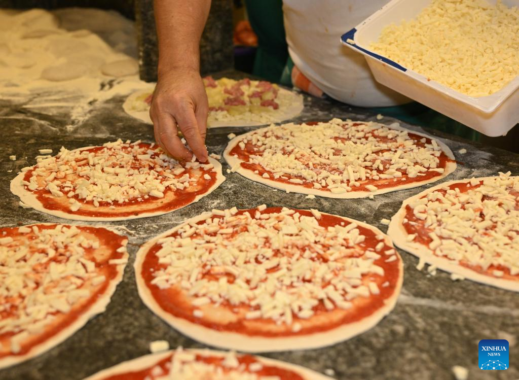 This photo taken on Dec. 11, 2025 shows pizzas at a restaurant named Ivo a Trastevere in Rome, Italy. (Photo by Alberto Lingria/Xinhua)