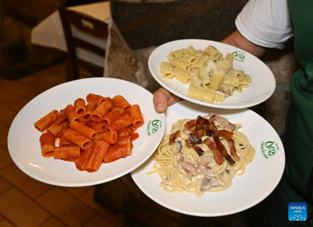This photo taken on Dec. 11, 2025 shows Rigatoni all'amatriciana (L), Spaghetti alla carbonara (lower R) Rigatoni Broccoli with Salsiccia at a restaurant named Ivo a Trastevere in Rome, Italy. (Photo by Alberto Lingria/Xinhua)