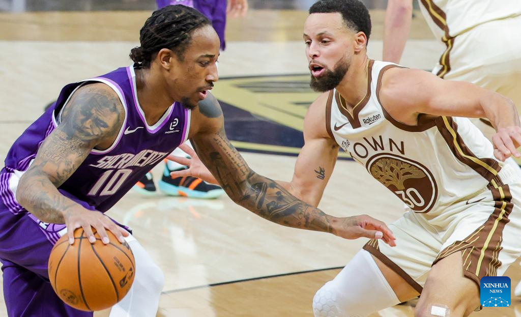 Golden State Warriors' Stephen Curry (R) defends Sacramento Kings' DeMar DeRozan during the 2025-2026 NBA regular season basketball game between Golden State Warriors and Sacramento Kings in San Francisco, the United States, Jan. 9, 2026. (Photo by Arthur Dong/Xinhua)
