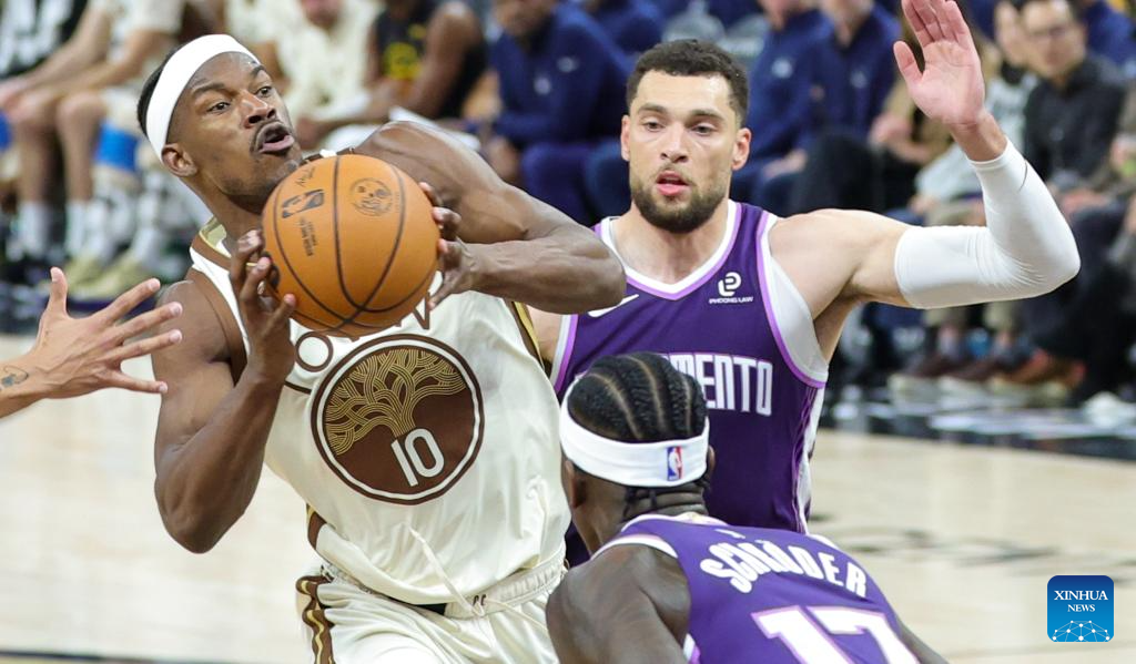 Golden State Warriors' Jimmy Butler III (R) breaks through during the 2025-2026 NBA regular season basketball game between Golden State Warriors and Sacramento Kings in San Francisco, the United States, Jan. 9, 2026. (Photo by Arthur Dong/Xinhua)