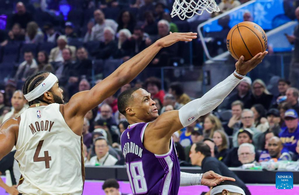 Sacramento Kings' Russell Westbrook (R) shoots during the 2025-2026 NBA regular season basketball game between Golden State Warriors and Sacramento Kings in San Francisco, the United States, Jan. 9, 2026. (Photo by Arthur Dong/Xinhua)