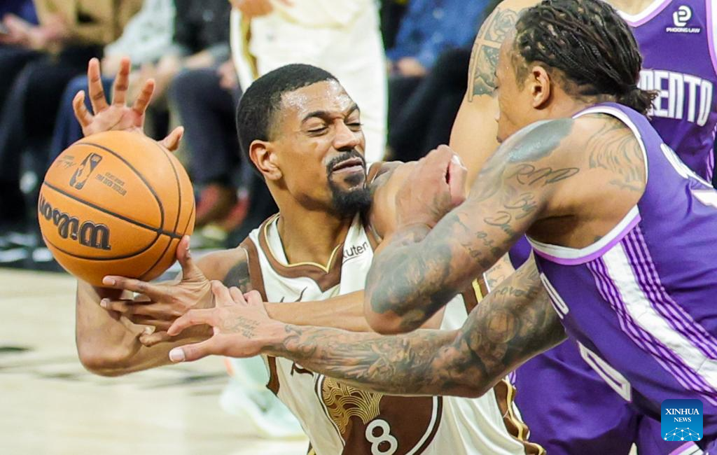 Golden State Warriors' De'Anthony Melton (L) shoots during the 2025-2026 NBA regular season basketball game between Golden State Warriors and Sacramento Kings in San Francisco, the United States, Jan. 9, 2026. (Photo by Arthur Dong/Xinhua)