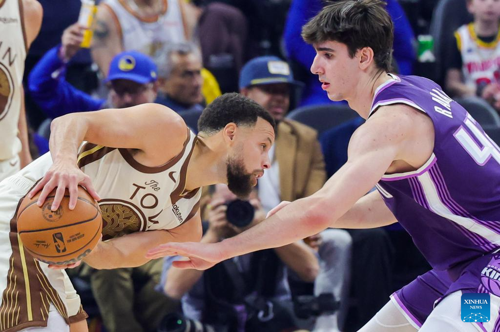 Golden State Warriors' Stephen Curry (L) vies with Sacramento Kings' Maxime Raynaud during the 2025-2026 NBA regular season basketball game between Golden State Warriors and Sacramento Kings in San Francisco, the United States, Jan. 9, 2026. (Photo by Arthur Dong/Xinhua)