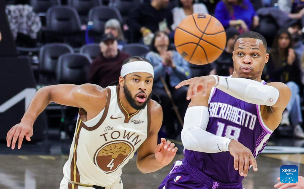 Sacramento Kings' Russell Westbrook (R) passes the ball past Golden State Warriors' Moses Moody during the 2025-2026 NBA regular season basketball game between Golden State Warriors and Sacramento Kings in San Francisco, the United States, Jan. 9, 2026. (Photo by Arthur Dong/Xinhua)