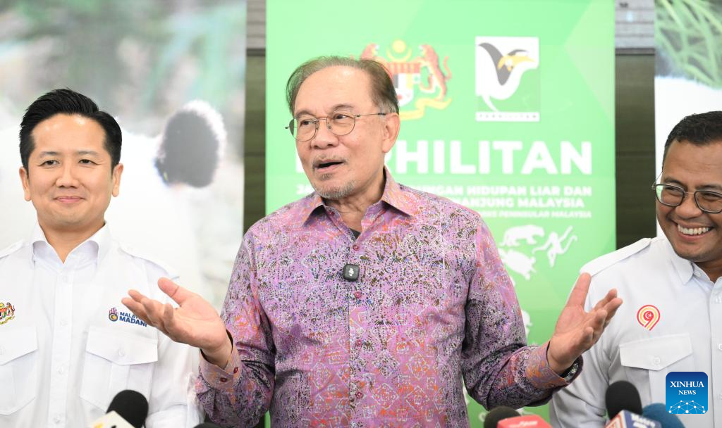 Malaysian Prime Minister Anwar Ibrahim speaks to the media at Zoo Negara in Selangor, Malaysia, on Jan. 10, 2026. China's giant pandas "Chenxing" and "Xiaoyue," currently on loan to Malaysia, officially met the public here on Saturday.(Xinhua/Cheng Yiheng)