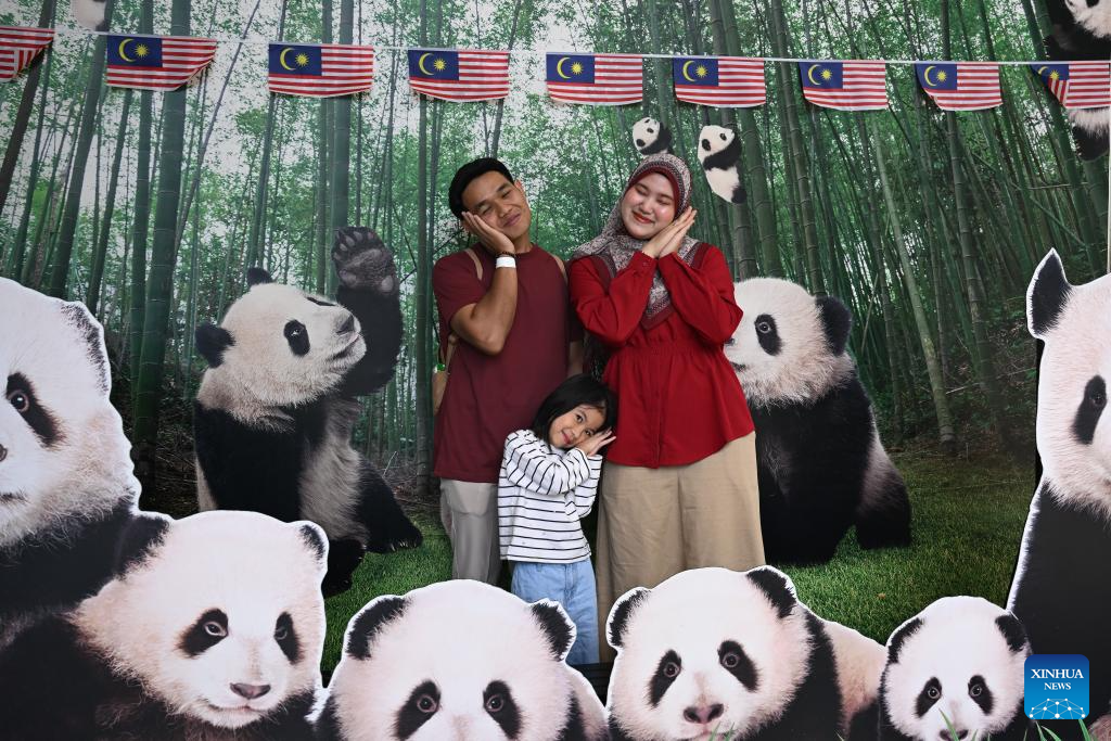 A family poses for photos with panda-themed decorations at Zoo Negara in Selangor, Malaysia, on Jan. 10, 2026. China's giant pandas "Chenxing" and "Xiaoyue," currently on loan to Malaysia, officially met the public here on Saturday.(Xinhua/Cheng Yiheng)