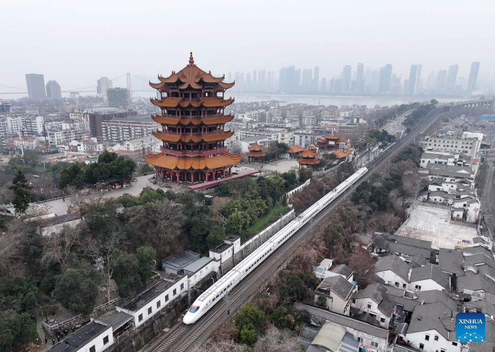 A drone photo taken on Jan. 25, 2026 shows a bullet train running past the Yellow Crane Tower scenic spot in Wuhan City, central China's Hubei Province. A new train schedule will be put into effect in China from Jan. 26. 2026. (Photo by Zhao Jun/Xinhua)