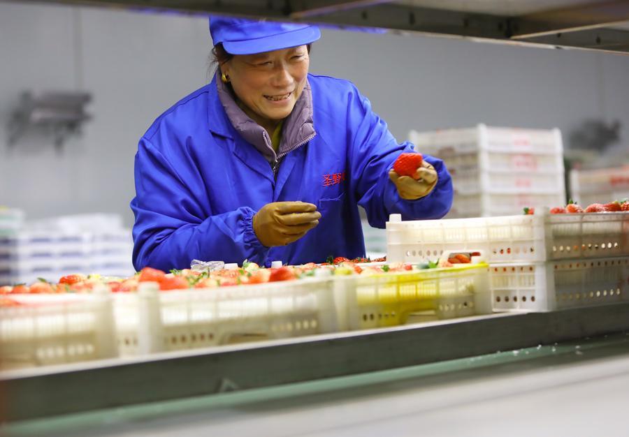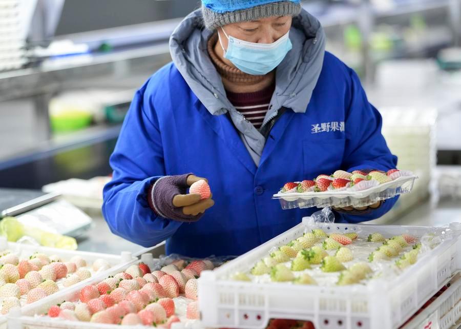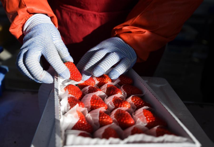A worker packs freshly-picked strawberries at a strawberry processing center in Donggang City, Dandong, northeast China's Liaoning Province, Dec. 7, 2023. (Xinhua/Chen Wei)