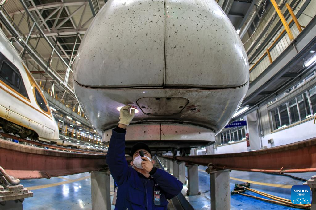 Staff members conduct maintenance work at a high-speed train base in Kunming, southwest China's Yunnan Province, Jan. 29, 2026. Railway departments nationwide are actively conducting train maintenance to ensure safe operations during the upcoming 2026 Spring Festival travel rush. (Photo by Yang Zixuan/Xinhua)