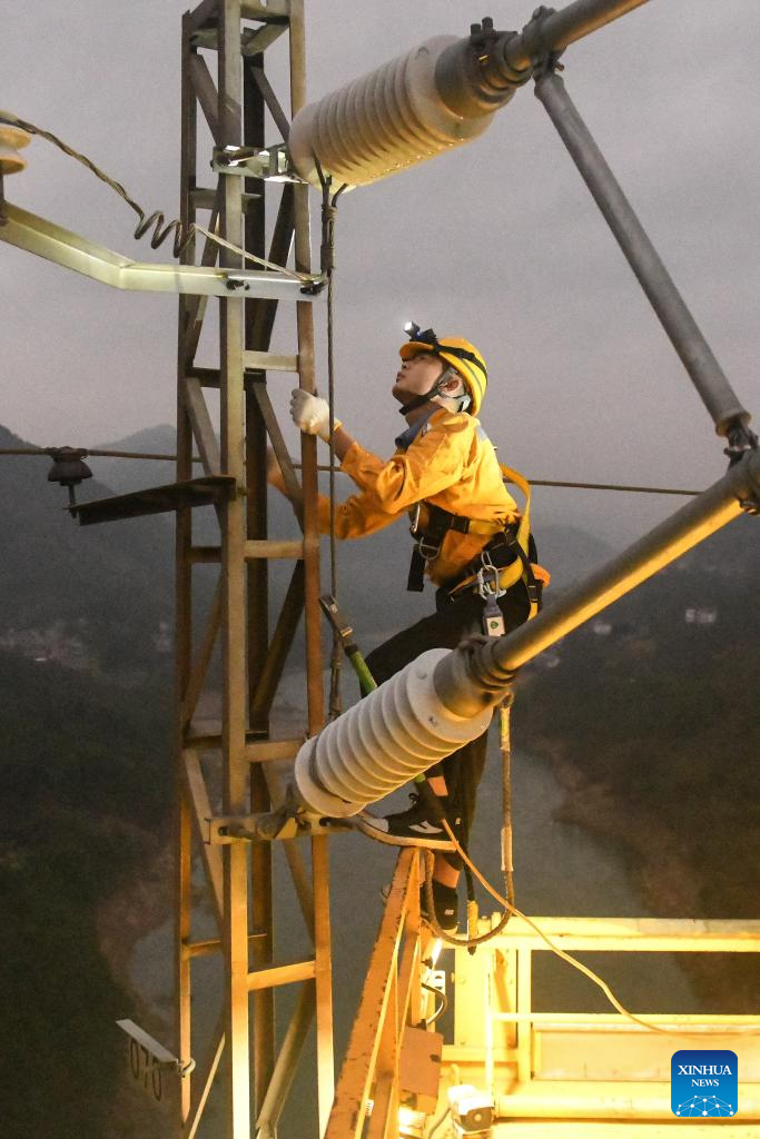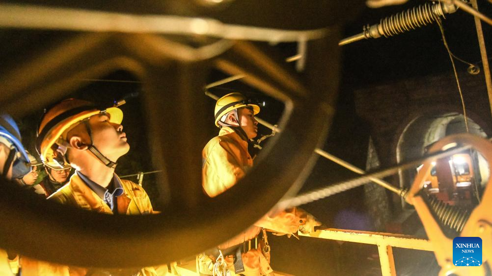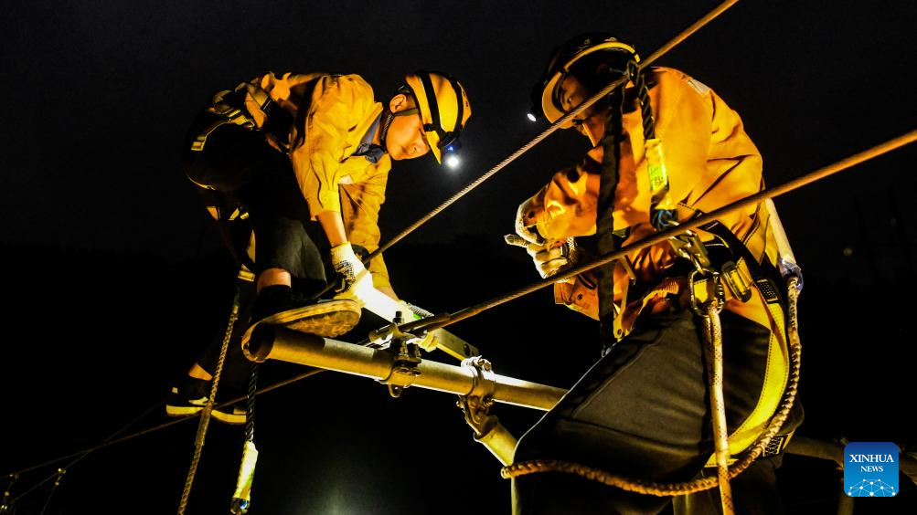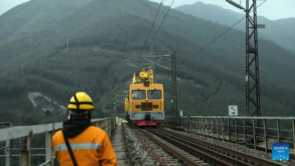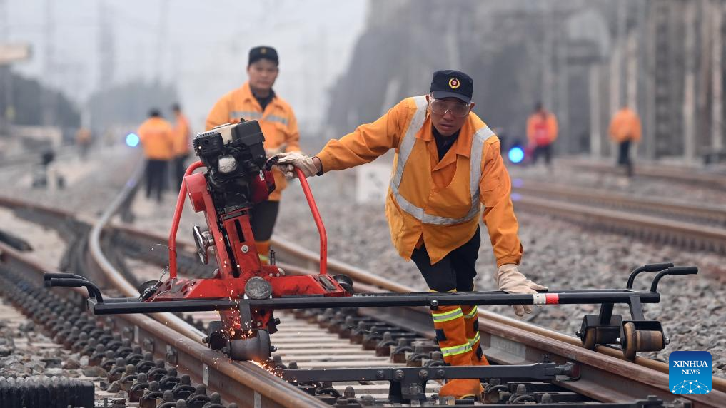 Workers of China Railway Nanning Group Co., Ltd grind rails in Baise, south China's Guangxi Zhuang Autonomous Region, Jan. 29, 2026. Railway departments nationwide are actively conducting train maintenance to ensure safe operations during the upcoming 2026 Spring Festival travel rush. (Xinhua/Zhang Ailin)