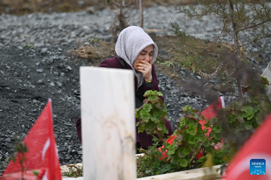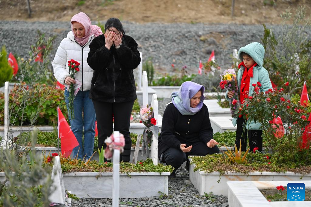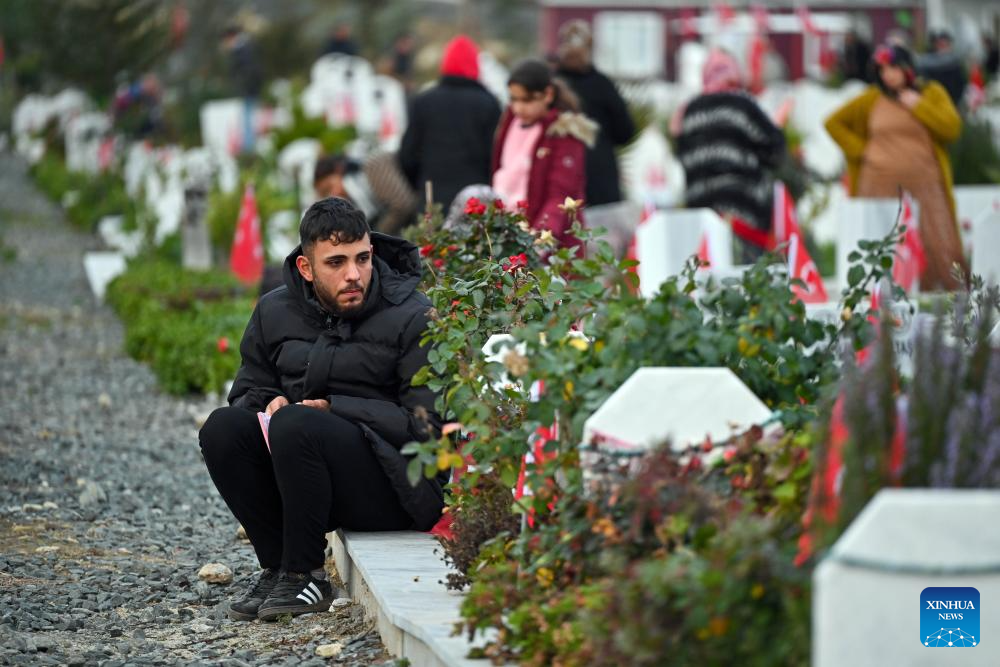 People mourn for their relatives who died in the Feb. 6, 2023 earthquakes at a cemetery in Antakya, Hatay province, Türkiye on Feb. 6, 2026. (Mustafa Kaya/Handout via Xinhua)