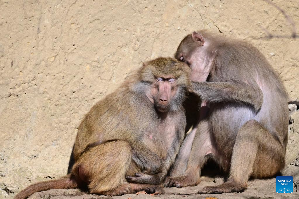 Two baboons are pictured at the Warsaw Zoo in Warsaw, Poland, Feb. 26, 2026. (Photo by Aleksky Witwicki/Xinhua)