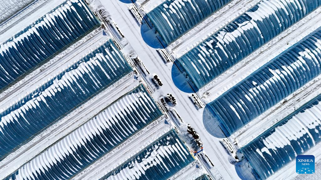 An aerial drone photo taken on Feb. 28, 2026 shows greenhouses for paddy rice seedling breeding at Youyi Farm Co., Ltd. under Beidahuang Group in Shuangyashan City, northeast China's Heilongjiang Province. Heilongjiang Province, dubbed "grain barn" of China, has entered a new farming season. In Shuangyashan City, staff members are engaged in clearing snow and securing plastic coverings for greenhouses for paddy rice seedling breeding. Maintenance and inspection of agricultural machinery are also underway. (Xinhua/Wang Song)