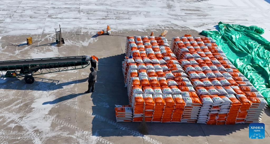 An aerial drone photo taken on Feb. 28, 2026 shows staff members packing paddy rice seeds at Youyi Farm Co., Ltd. under Beidahuang Group in Shuangyashan City, northeast China's Heilongjiang Province. Heilongjiang Province, dubbed "grain barn" of China, has entered a new farming season. In Shuangyashan City, staff members are engaged in clearing snow and securing plastic coverings for greenhouses for paddy rice seedling breeding. Maintenance and inspection of agricultural machinery are also underway. (Xinhua/Wang Song)
