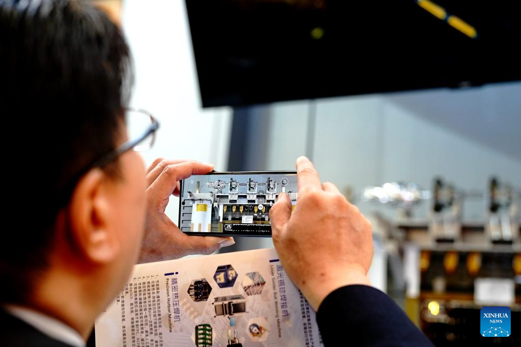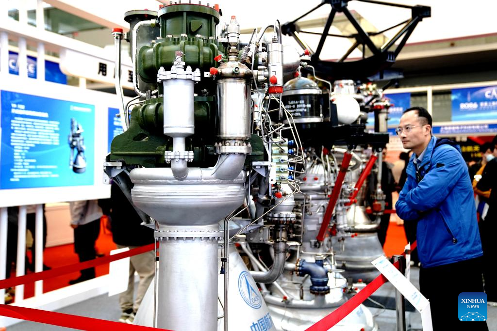 A man views a rocket engine during the 2026 Shanghai Commercial Aerospace Conference & Exhibition at Shanghai New International Expo Center in Shanghai, east China, March 12, 2026. This event, also the founding session, kicked off here on Thursday and will last till March 14. (Xinhua/Zhang Jiansong)