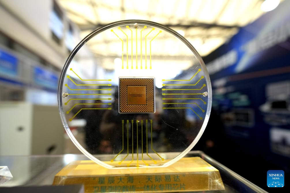 This photo taken on March 12, 2026 shows a special-purpose chip for satellite during the 2026 Shanghai Commercial Aerospace Conference & Exhibition at Shanghai New International Expo Center in Shanghai, east China. This event, also the founding session, kicked off here on Thursday and will last till March 14. (Xinhua/Zhang Jiansong)