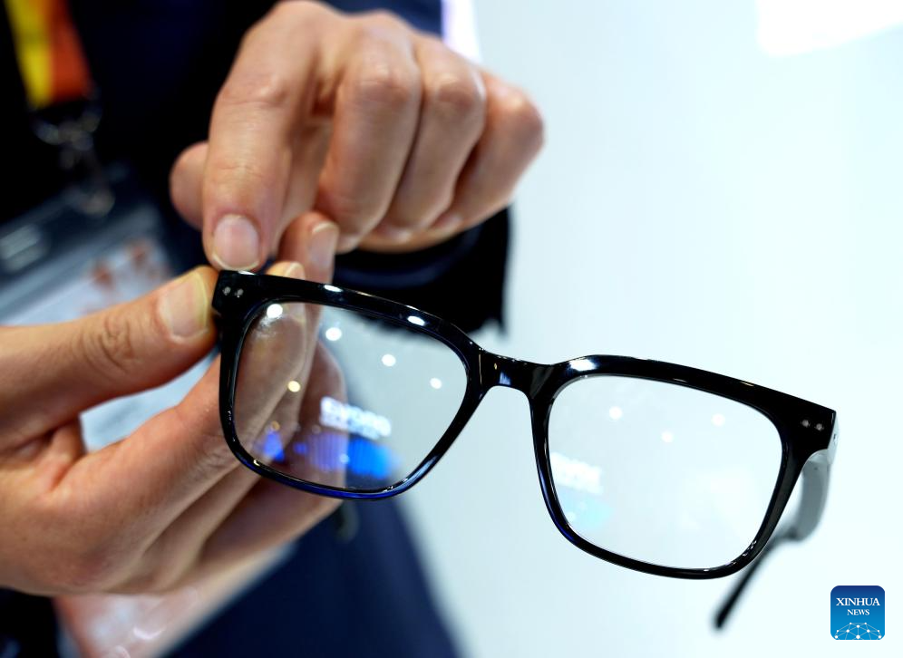 A pair of smart hearing glasses is pictured at the Medical Equipment & Healthcare Products exhibition area during the eighth China International Import Expo (CIIE) in east China's Shanghai, Nov. 6, 2025. At the eighth CIIE, a range of elder-friendly health products and services were showcased across multiple exhibition areas. The displays covered diverse fields such as rehabilitation aids, elder-friendly products, and sleep restoration, aiming to address the practical needs of the elderly population. (Xinhua/Liu Ying)