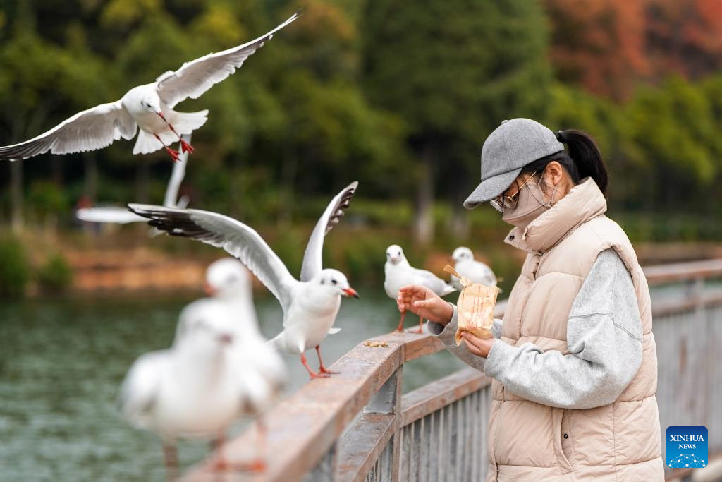 A tourist feeds black-headed gulls at a wetland park by the Dianchi Lake in Kunming, southwest China's Yunnan Province, on Dec. 11, 2025. (Xinhua/Peng Yikai)