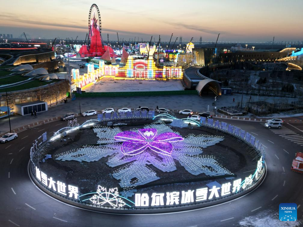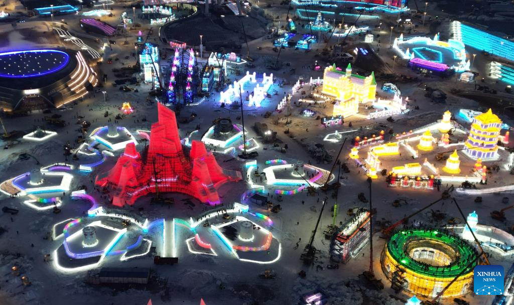 A drone photo taken on Dec. 12, 2025 shows the Ice and Snow World under construction in Harbin, northeast China's Heilongjiang Province. The 27th edition of Ice and Snow World has entered its final stage of construction. (Photo by Zhang Shu/Xinhua)