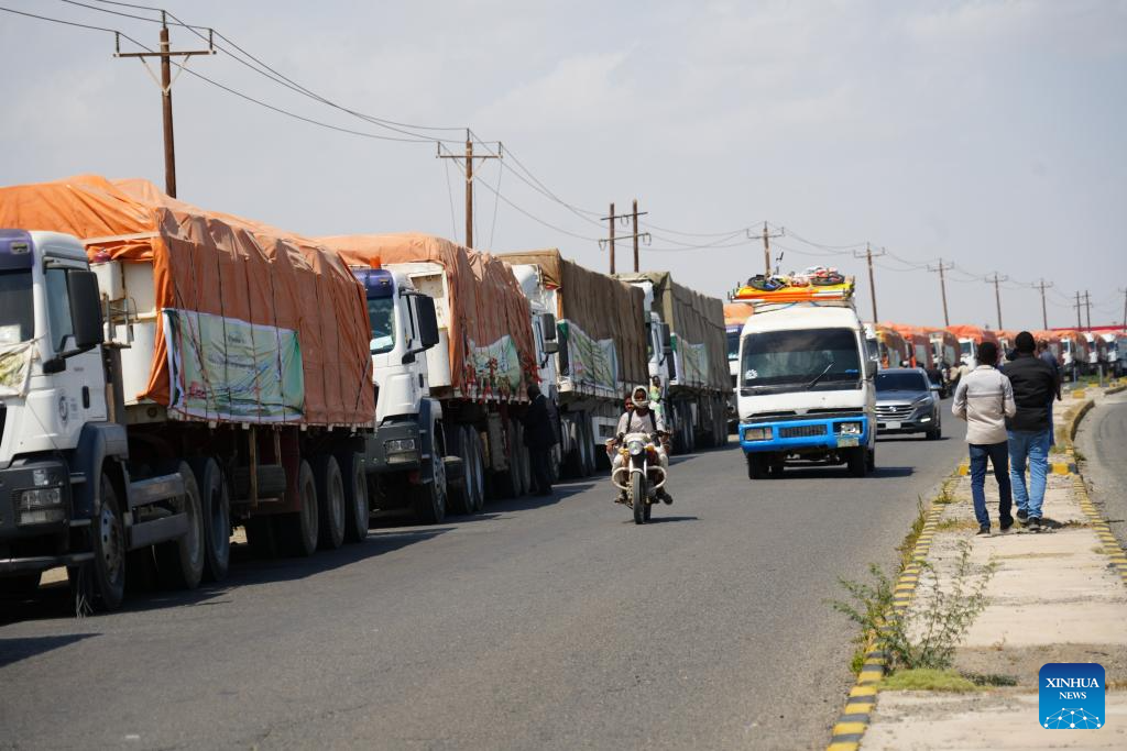 This photo taken on March 8, 2026 shows trucks loaded with humanitarian aid in Port Sudan, eastern Sudan. As Sudan's civil war approaches its third anniversary, the United Nations warns that humanitarian needs are rising, while the Sudanese government maintains that food supplies remain under control, raising concerns about the country's future food security. (Photo by Urqia Elzaki/Xinhua)