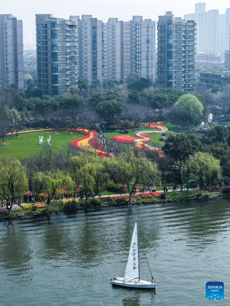 Tourists view flowers by Guazhu lake in Shaoxing, east China's Zhejiang Province, March 13, 2026. (Xinhua/Xu Yu)