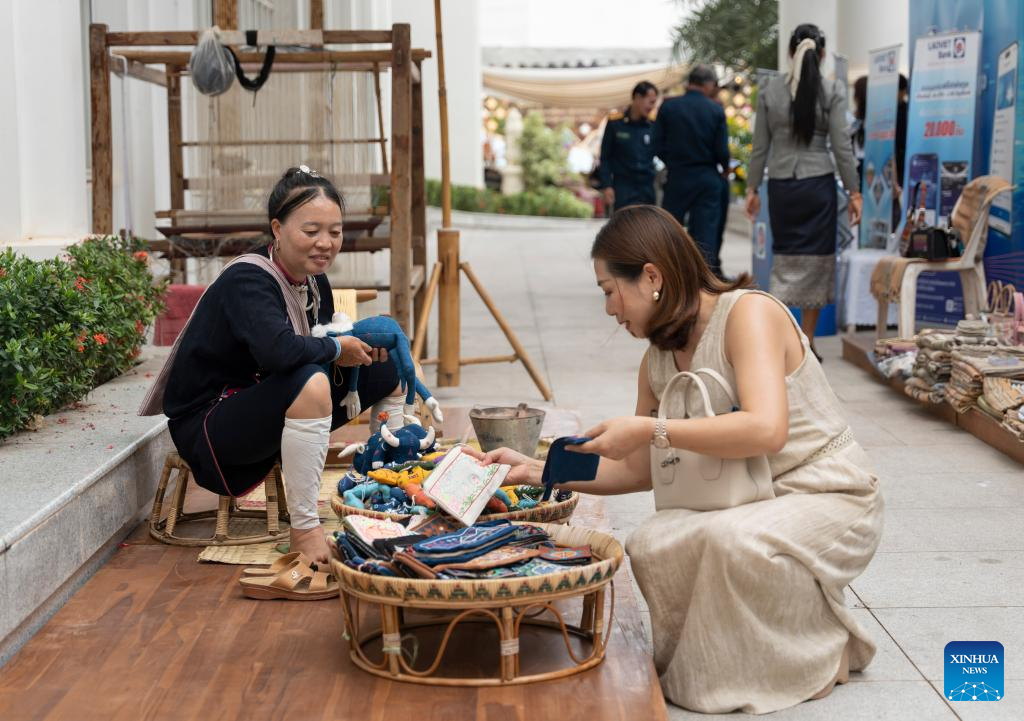 A stall owner displays handicrafts during the 24th Lao Handicraft Festival in Vientiane, Laos, Oct. 23, 2025. The festival is held here from Oct. 22 to 26. More than 130 exhibition booths have been set up, displaying textiles, jewellery, pottery, wood carvings, etc. In addition, visitors can enjoy a wide range of interactive cultural experiences during the festival. (Photo by Kaikeo Saiyasane/Xinhua)