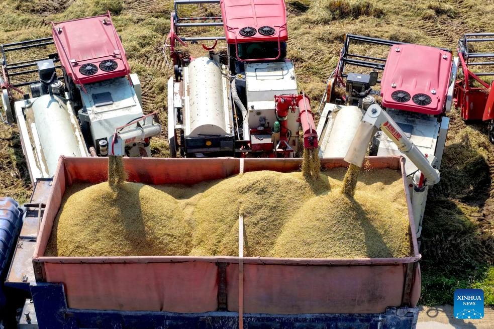 This aerial drone photo taken on Oct. 23, 2025 shows reapers loading harvested rice in Bozhou, east China's Anhui Province. Thursday marks the Frost's Descent. As the last solar term in autumn, Frost's Descent signifies the upcoming winter. Days around Frost's Descent are harvest time for most crops. (Photo by Liu Qinli/Xinhua)