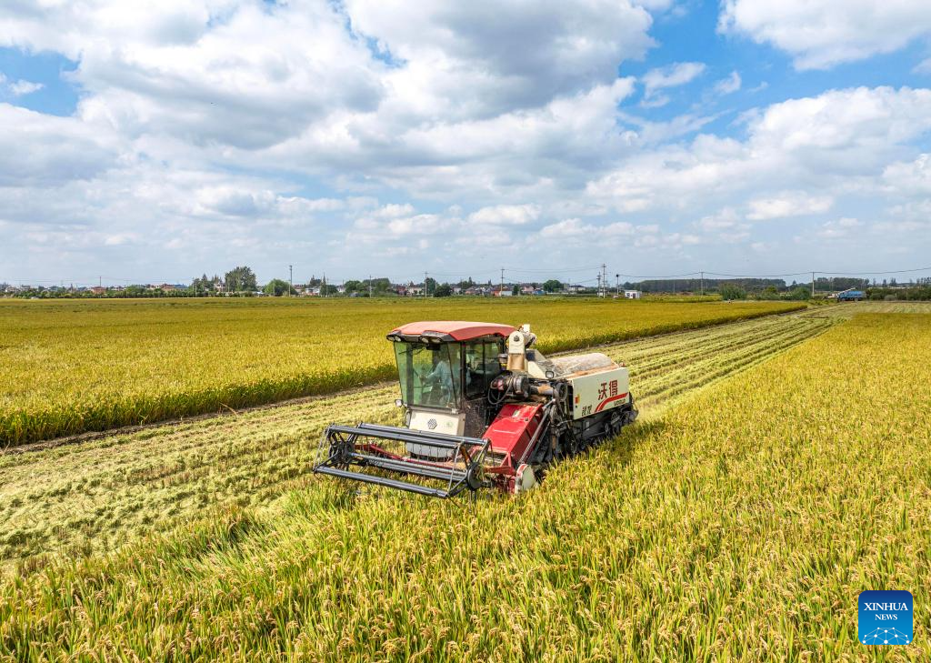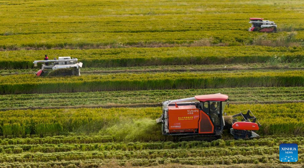 This aerial drone photo taken on Oct. 23, 2025 shows farmers harvesting rice in Kunshan, east China's Jiangsu Province. Thursday marks the Frost's Descent. As the last solar term in autumn, Frost's Descent signifies the upcoming winter. Days around Frost's Descent are harvest time for most crops. (Photo by Wang Xuzhong/Xinhua)