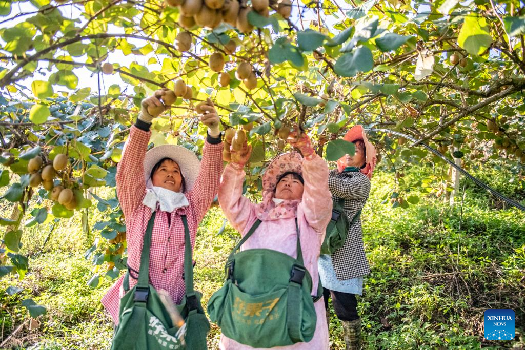 Farmers pick kiwi-fruits in Wenshan Zhuang and Miao Autonomous Prefecture, southwest China's Yunnan Province, Oct. 23, 2025. Thursday marks the Frost's Descent. As the last solar term in autumn, Frost's Descent signifies the upcoming winter. Days around Frost's Descent are harvest time for most crops. (Photo by Xiong Pingxiang/Xinhua)
