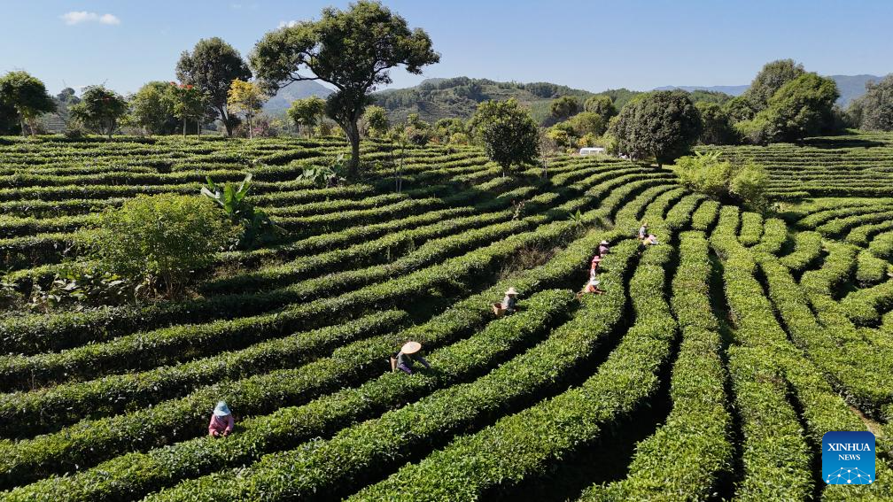 This aerial drone photo taken on Oct. 23, 2025 shows farmers picking tea leaves in Pu'er, southwest China's Yunnan Province. Thursday marks the Frost's Descent. As the last solar term in autumn, Frost's Descent signifies the upcoming winter. Days around Frost's Descent are harvest time for most crops. (Photo by Yang Tingrong/Xinhua)