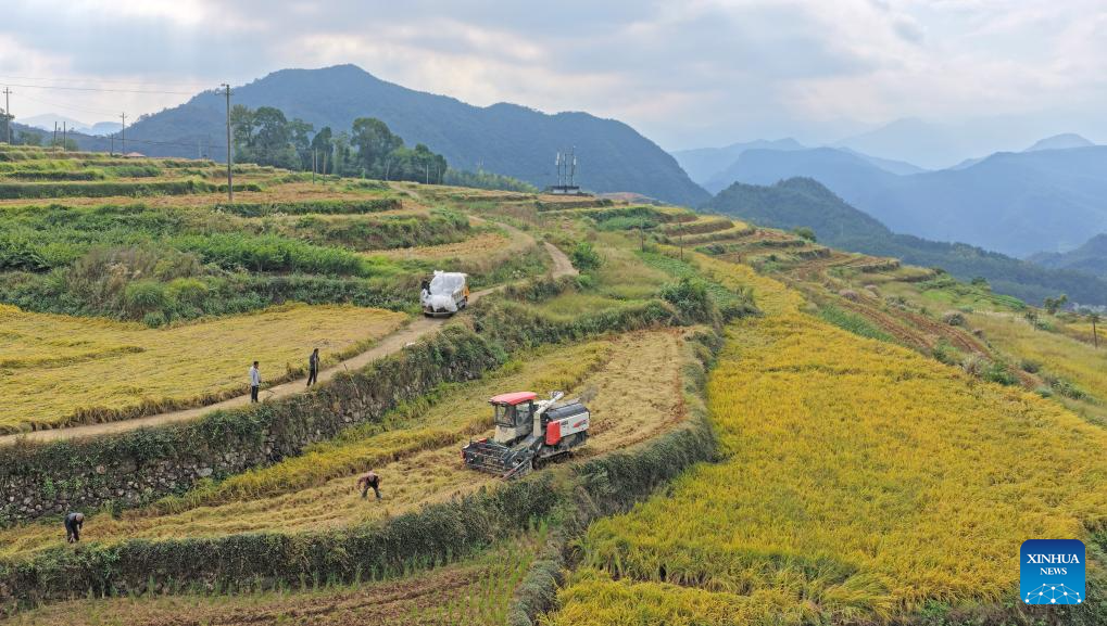 This aerial drone photo taken on Oct. 23, 2025 shows farmers harvesting rice in Tengchong, southwest China's Yunnan Province. Thursday marks the Frost's Descent. As the last solar term in autumn, Frost's Descent signifies the upcoming winter. Days around Frost's Descent are harvest time for most crops. (Photo by Gong Zujin/Xinhua)