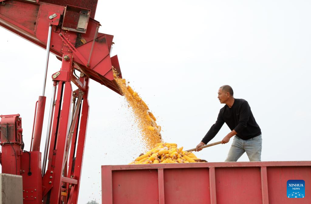 A farmer works with harvested corn in Binzhou, east China's Shandong Province, Oct. 23, 2025. Thursday marks the Frost's Descent. As the last solar term in autumn, Frost's Descent signifies the upcoming winter. Days around Frost's Descent are harvest time for most crops. (Photo by Chen Bin/Xinhua)