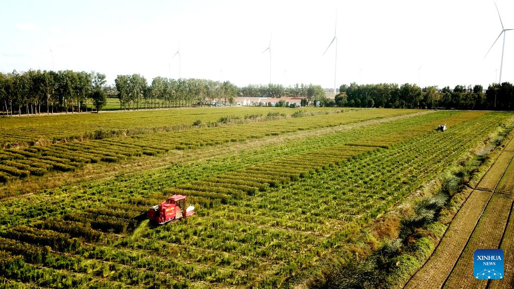 This aerial drone photo taken on Oct. 23, 2025 shows farmers harvesting celery in Dongying, east China's Shandong Province. Thursday marks the Frost's Descent. As the last solar term in autumn, Frost's Descent signifies the upcoming winter. Days around Frost's Descent are harvest time for most crops. (Photo by Liu Yunjie/Xinhua)