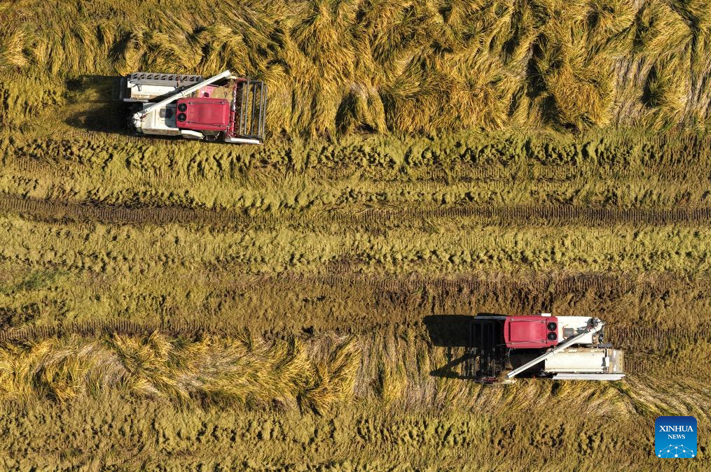 This aerial drone photo taken on Oct. 23, 2025 shows reapers harvesting rice in Huzhou, east China's Zhejiang Province. Thursday marks the Frost's Descent. As the last solar term in autumn, Frost's Descent signifies the upcoming winter. Days around Frost's Descent are harvest time for most crops. (Photo by Ni Lifang/Xinhua)
