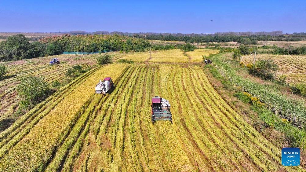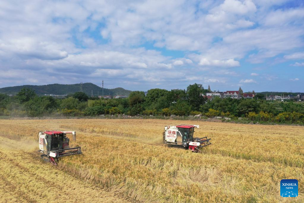 This aerial drone photo taken on Oct. 23, 2025 shows farmers harvesting rice in Hefei, east China's Anhui Province. Thursday marks the Frost's Descent. As the last solar term in autumn, Frost's Descent signifies the upcoming winter. Days around Frost's Descent are harvest time for most crops. (Photo by Chen Sanhu/Xinhua)