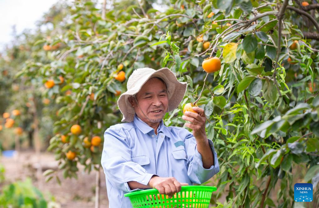 A farmer harvests persimmons in Nantong, east China's Jiangsu Province, Oct. 23, 2025. Thursday marks the Frost's Descent. As the last solar term in autumn, Frost's Descent signifies the upcoming winter. Days around Frost's Descent are harvest time for most crops. (Photo by Zhai Huiyong/Xinhua)