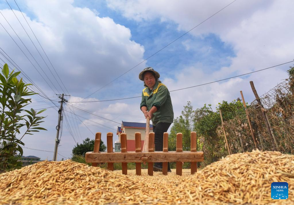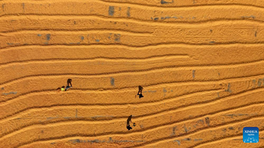 This drone photo taken on Oct. 23, 2025 shows a farmer drying paddy in Hengyang, central China's Hunan Province. Thursday marks the Frost's Descent. As the last solar term in autumn, Frost's Descent signifies the upcoming winter. Days around Frost's Descent are harvest time for most crops. (Photo by Cao Zhengping/Xinhua)