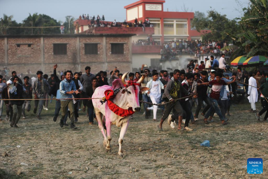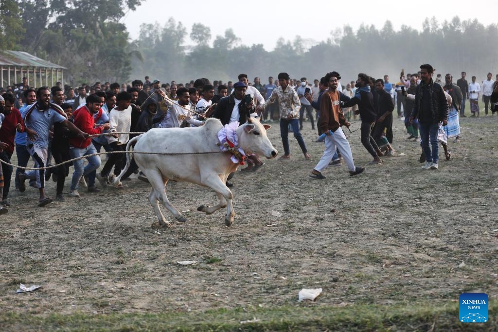 People and a cow participate in a traditional rural bull race in Dohar Upazila, on the outskirts of Dhaka, Bangladesh, Jan. 23, 2026. Traditional bull races are popular in the area and have generated great excitement among local audiences. (Photo by Habibur Rahman/Xinhua)