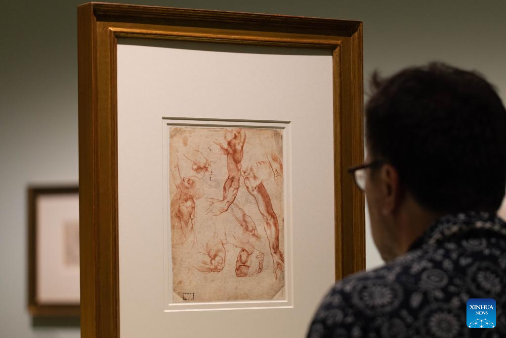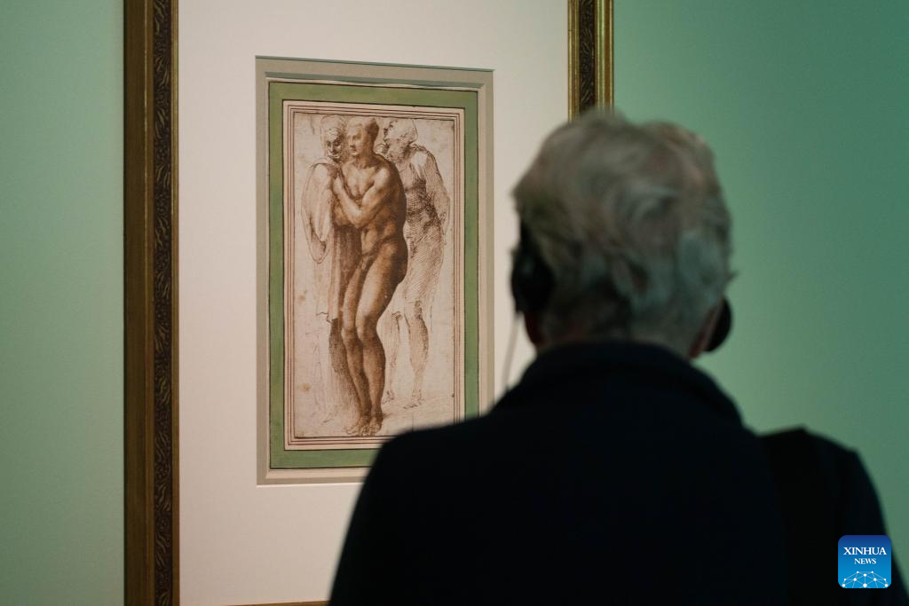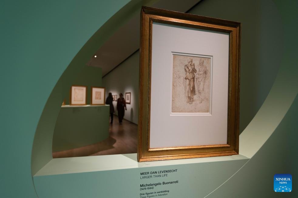 A drawing by Michelangelo is seen during the media preview of the exhibition "Michelangelo's Men" at the Teylers Museum in Haarlem, the Netherlands, Oct. 13, 2025. The exhibition, which will be open to the public on Wednesday, showcases the works of Italian artist Michelangelo in celebration of his 550th birth anniversary. The exhibition will last until Jan. 25, 2026. (Photo by Sylvia Lederer/Xinhua)
