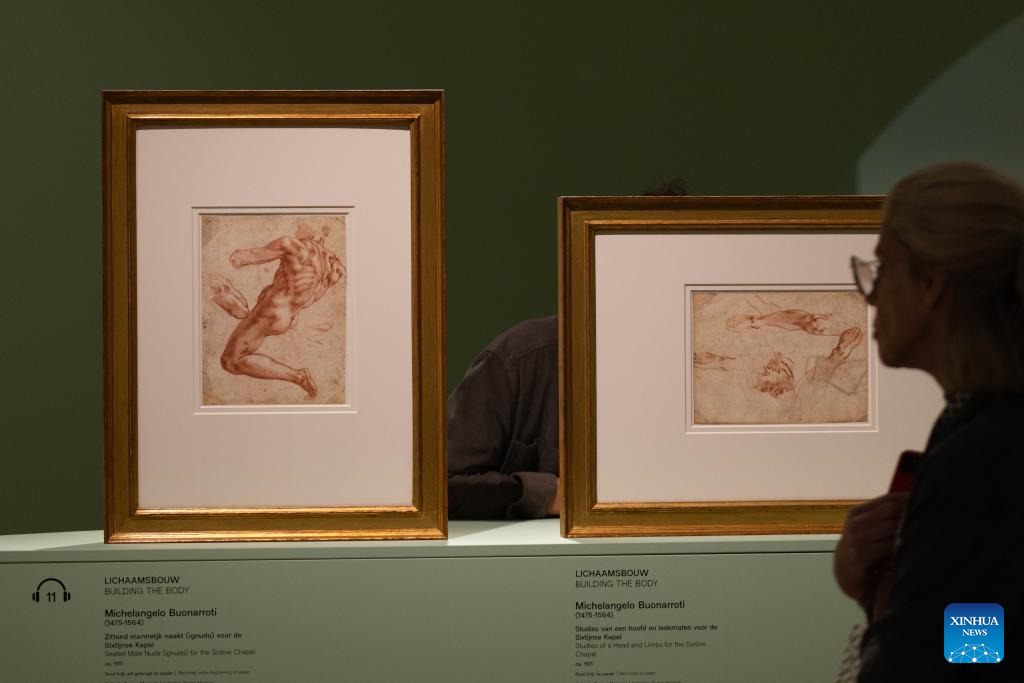 A visitor views drawings by Michelangelo during the media preview of the exhibition "Michelangelo's Men" at the Teylers Museum in Haarlem, the Netherlands, Oct. 13, 2025. The exhibition, which will be open to the public on Wednesday, showcases the works of Italian artist Michelangelo in celebration of his 550th birth anniversary. The exhibition will last until Jan. 25, 2026. (Photo by Sylvia Lederer/Xinhua)